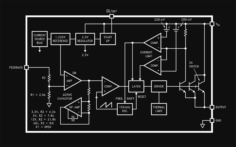 An internal voltage reference sets the standard against which the output voltage is compared. This is essential for the regulation process.