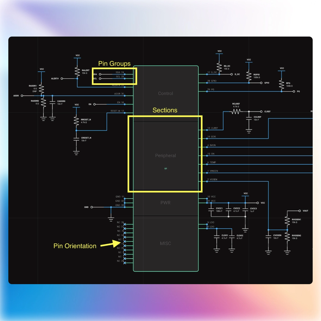 Flux's parametric symbols change how we view schematic symbols by offering you customization and flexibility. With parametric symbols, your team can better organize your schematic symbols by grouping pins based on functionality and logical connection, without needing to physically draw the symbol. Want all GPIO to be grouped together? Maybe you want all power pins to be on the left side of the symbol? Or, do you want all ADC channel pins to be next to each other?
