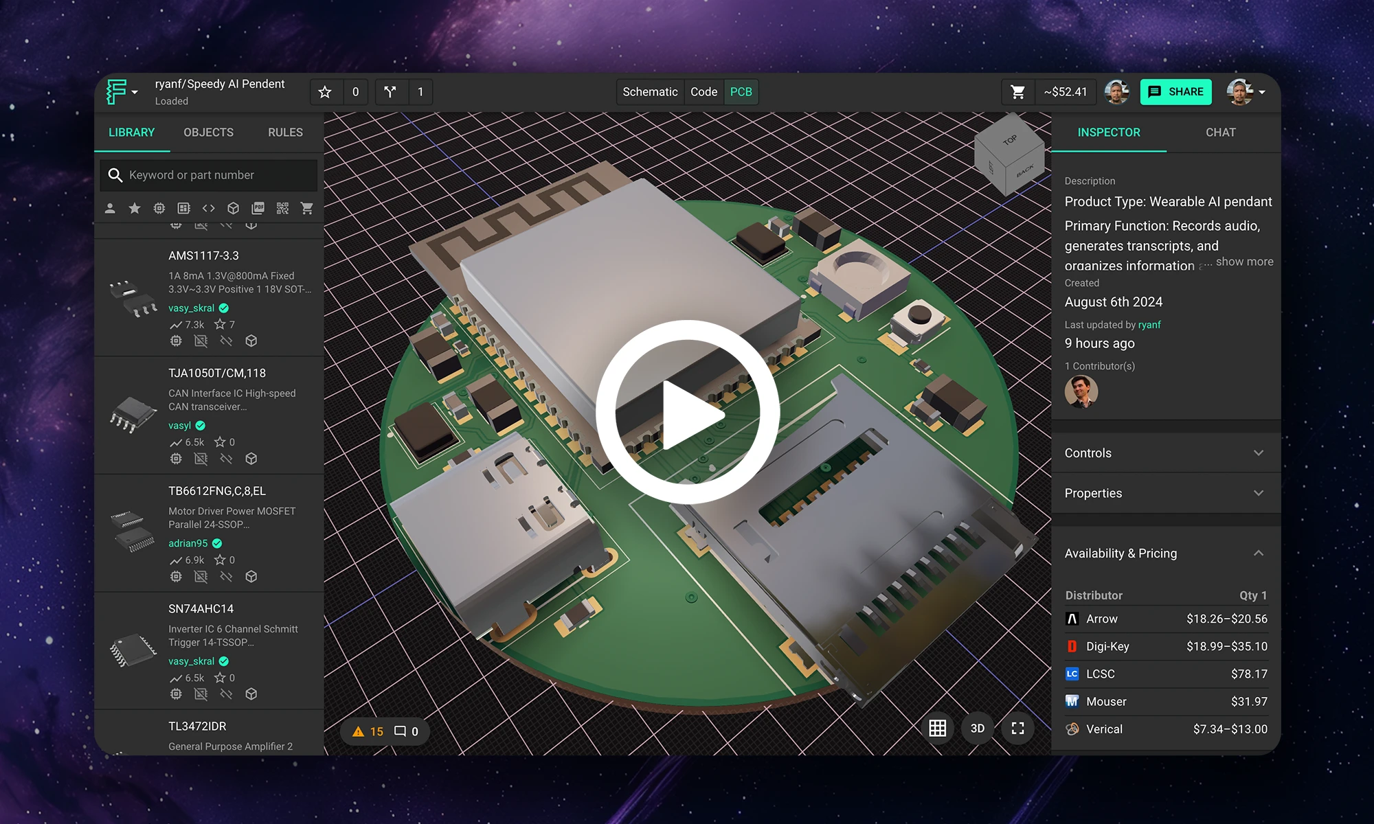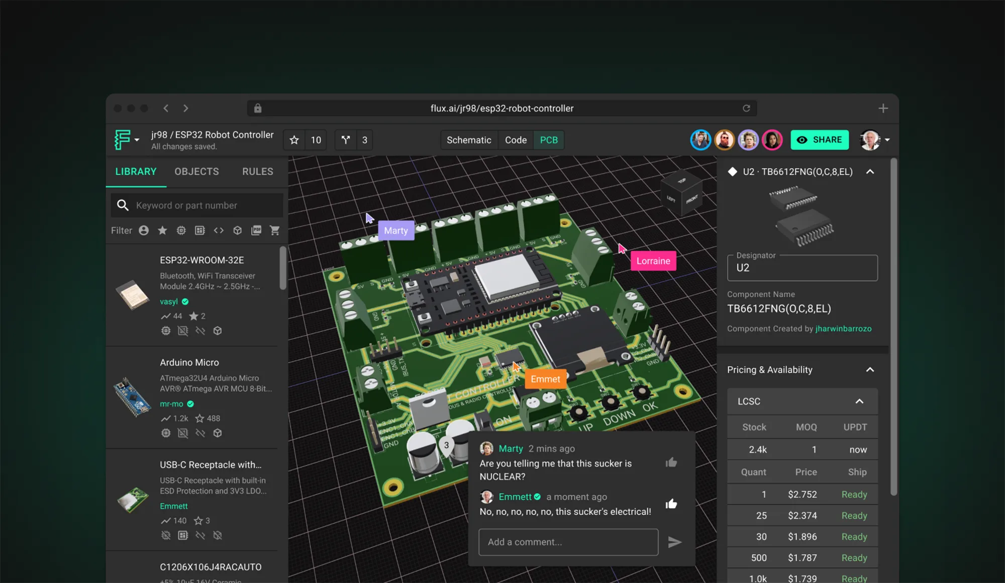 Whether you are exploring “What is a PCB?” for the first time or moving into advanced hardware engineering, modern tools make the process easier than ever. With Flux's AI-assisted platform, you can skip the steep learning curve of popular ECAD applications and design collaboratively directly in your browser. Once your board is routed and ready for fabrication, Flux's built-in supply chain features connect you directly with worldwide distributors to source parts instantly. Sign up for free today and start building!