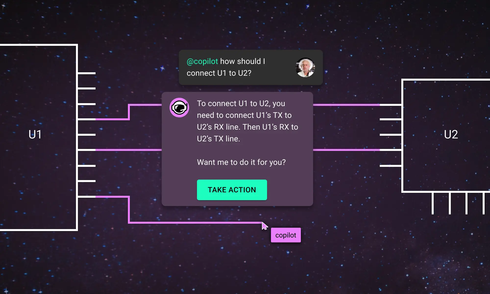 Copilot bridges the firmware<>hardware gap by providing firmware engineers with direct access to hardware information like netlists and pins, streamlining firmware development and reducing delays.