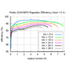 The efficiency of a voltage regulator, defined as (Power out)/(Power in), is an important measure of its performance, especially when battery life or heat are concerns. As shown in the graph below, these switching regulators have an efficiency of 85% to 95% for most combinations of input voltage and load.